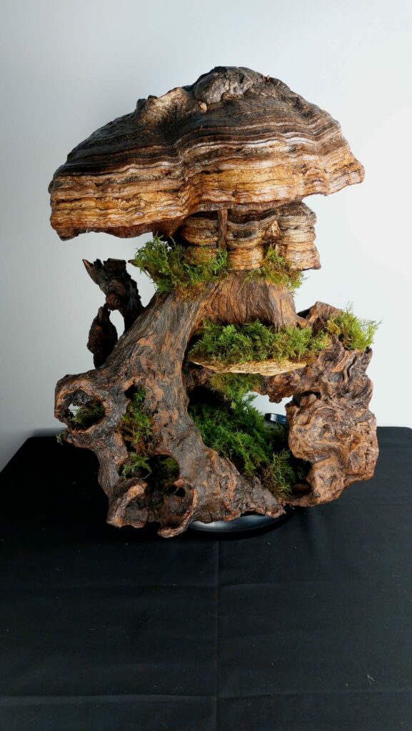 De ces fragments de nature, je façonne des lampes uniques, de petites galaxies terrestres. Une souche d’arbre devient l’ossature d’un univers miniature, un bouquet de champignons se change en source de lueurs douces, et la mousse sèche se métamorphose en tapis féerique sur lequel dansent les reflets. Chaque lampe est un monde intime, une histoire sculptée dans le bois et la lumière — un écho de ma propre renaissance.