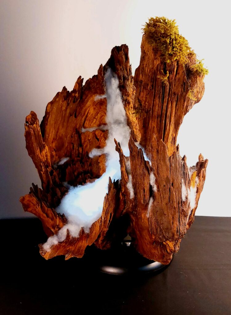 Je rassemble ces éclats de nature pour créer des mondes miniatures, nés d’un chemin de vie difficile et de la force trouvée sous les arbres.